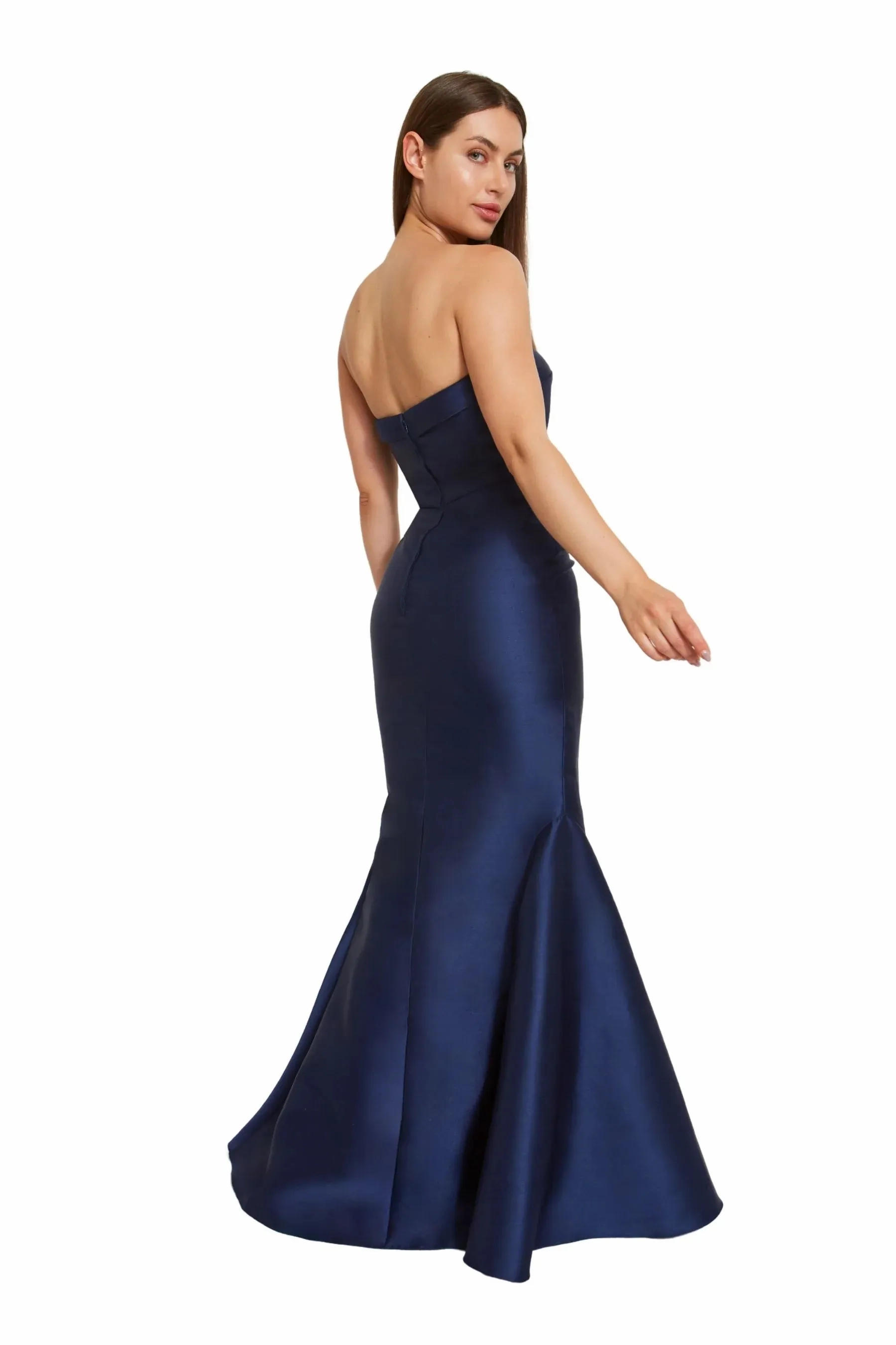 This stunning gown showcases a strapless bodice with a charming fold-over detail. The mermaid-style skirt elegantly hugs the silhouette, highlighted by a delicate pleated peplum at the waist and a flowing cascading ruffle. Crafted from luxurious Mikado fabric, it exudes sophistication and grace.