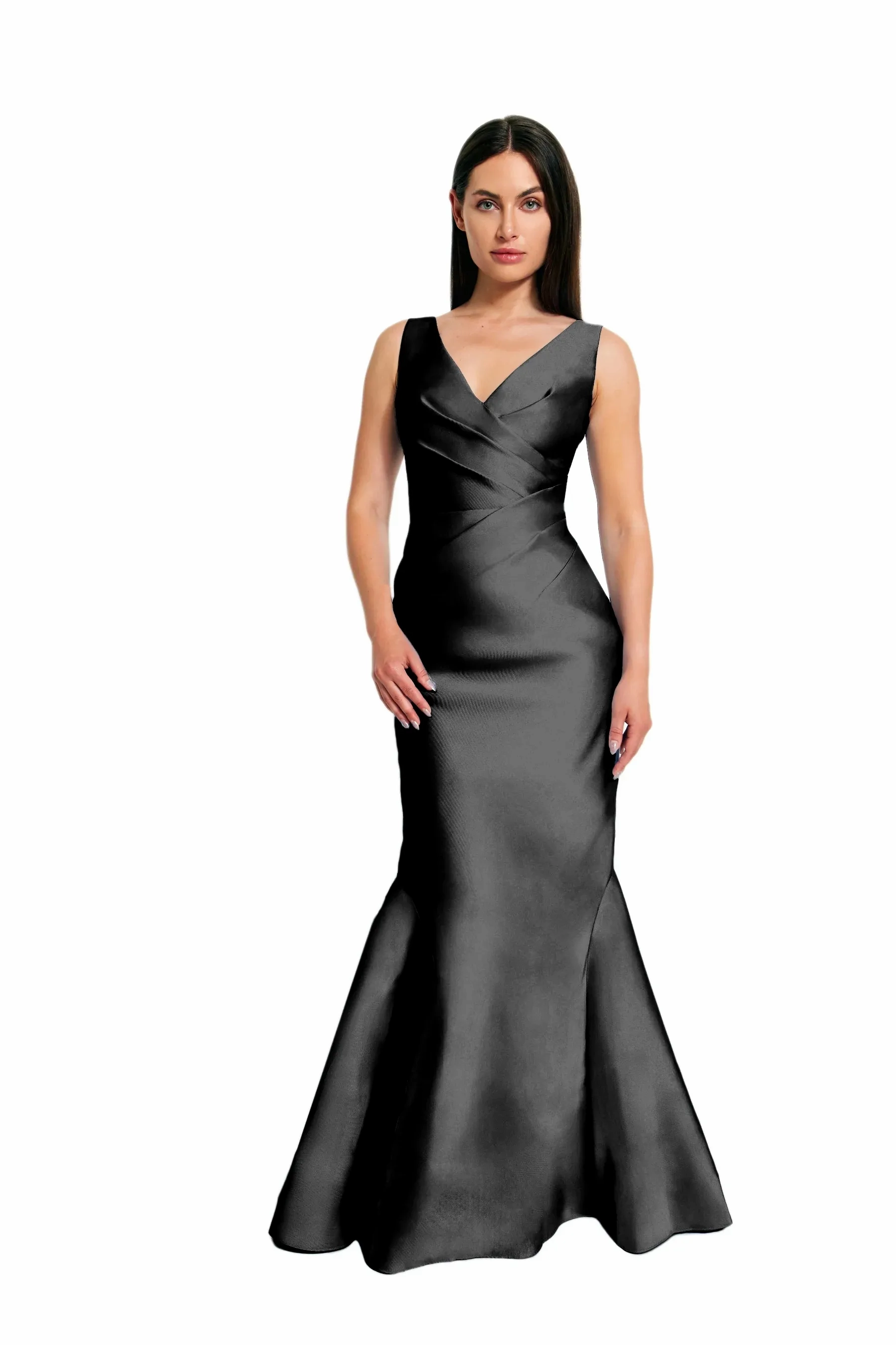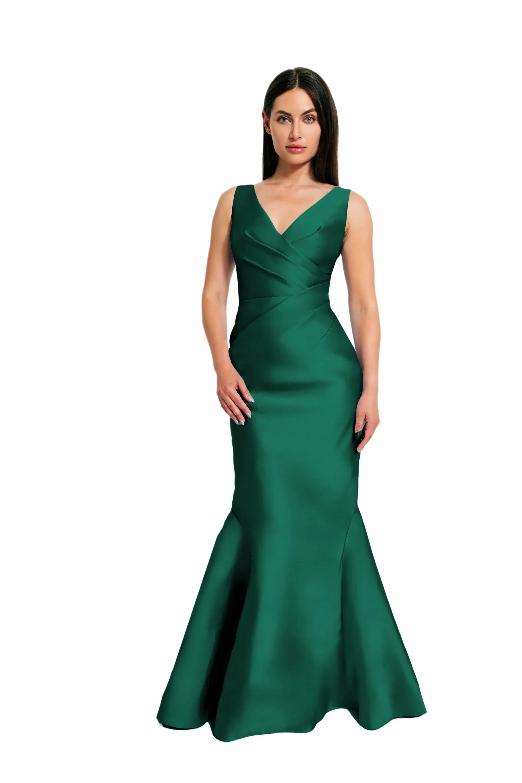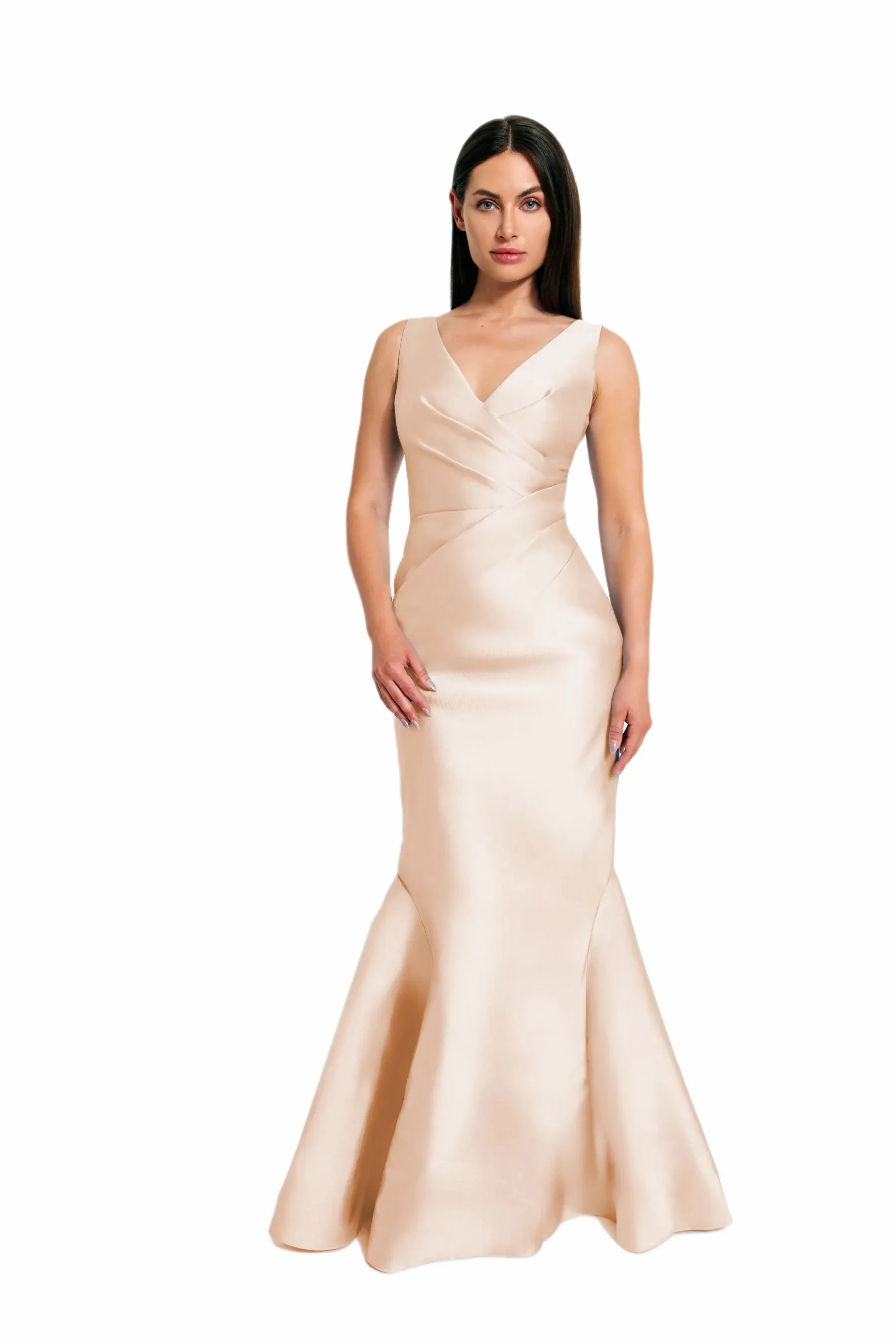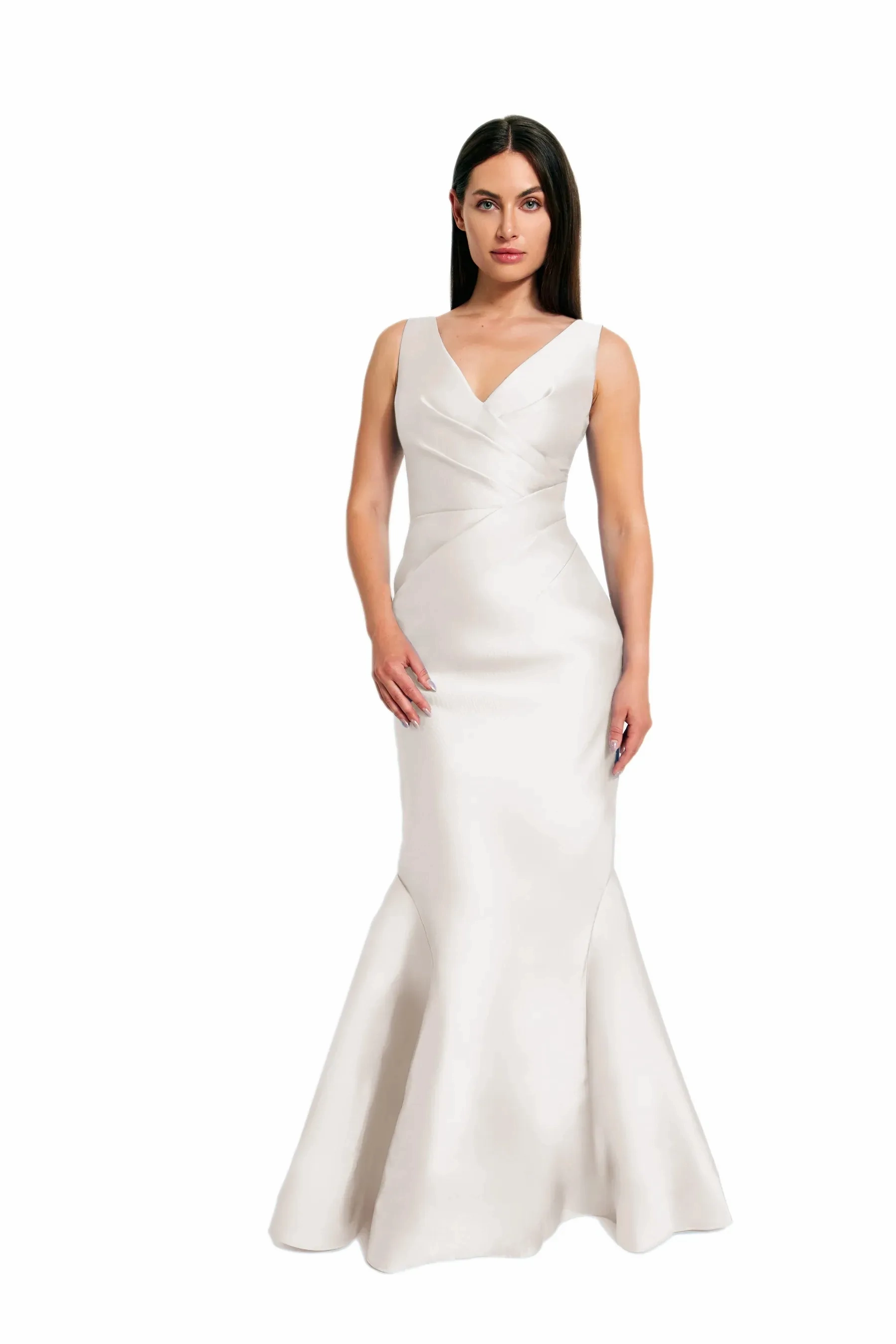 Elevate your style with this stunning V-neck top, highlighted by distinctive diagonal pleating at the waist. The elegant mermaid skirt, enhanced with godets, creates a graceful silhouette. Crafted from refined Mikado fabric, this ensemble radiates sophistication.