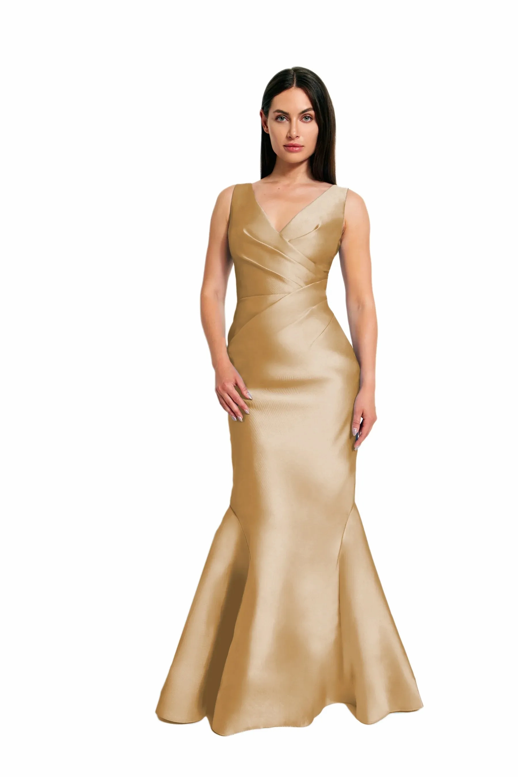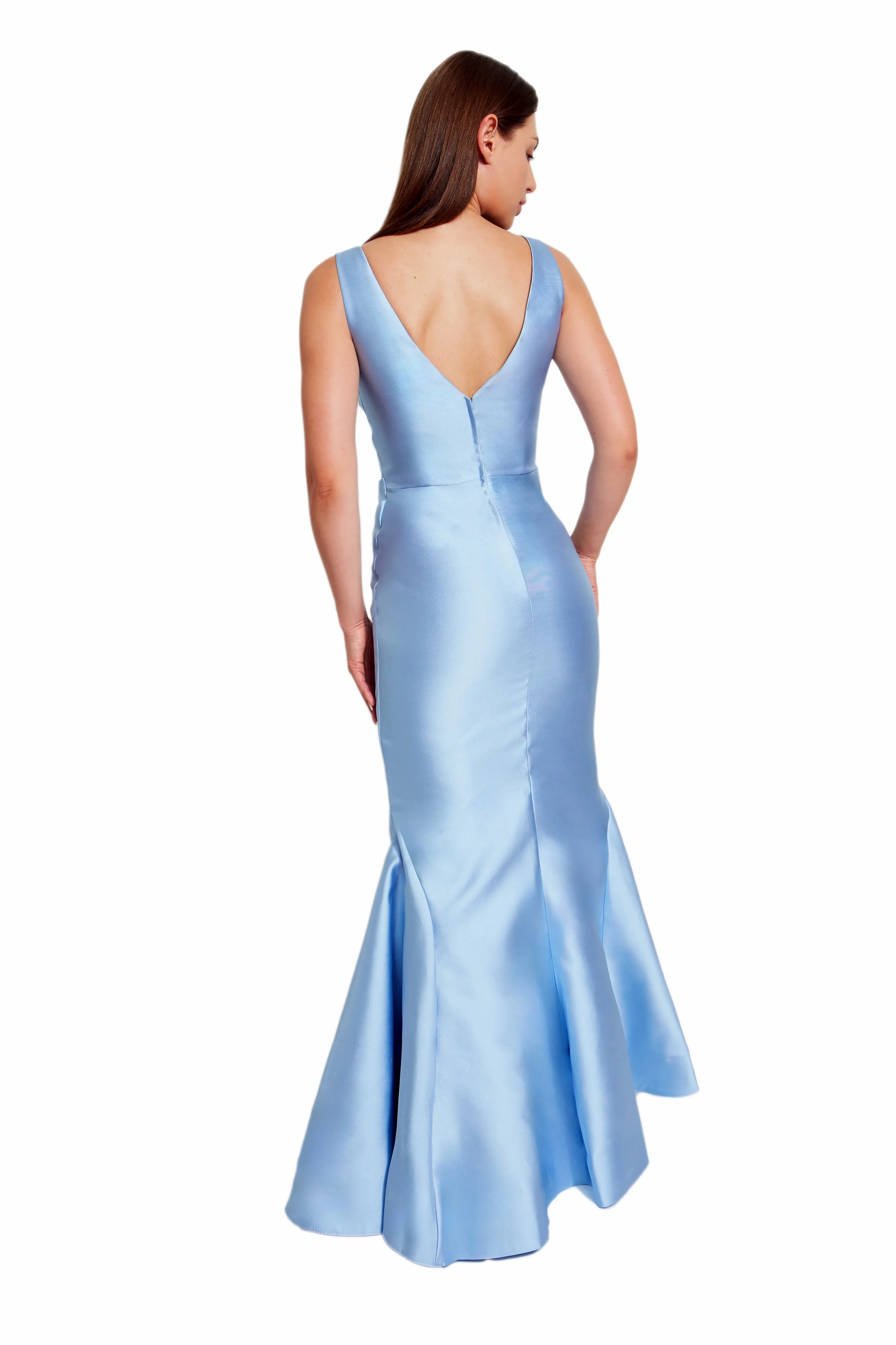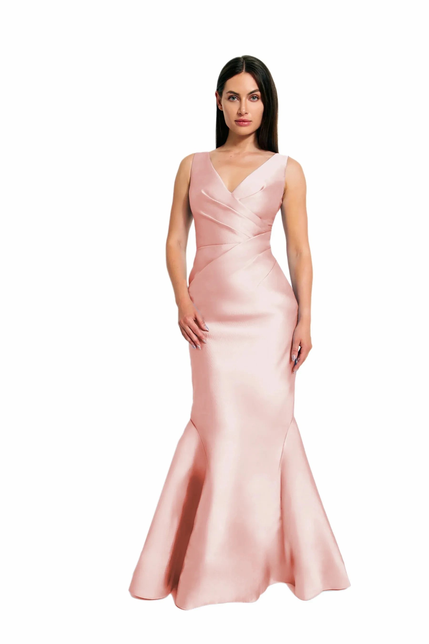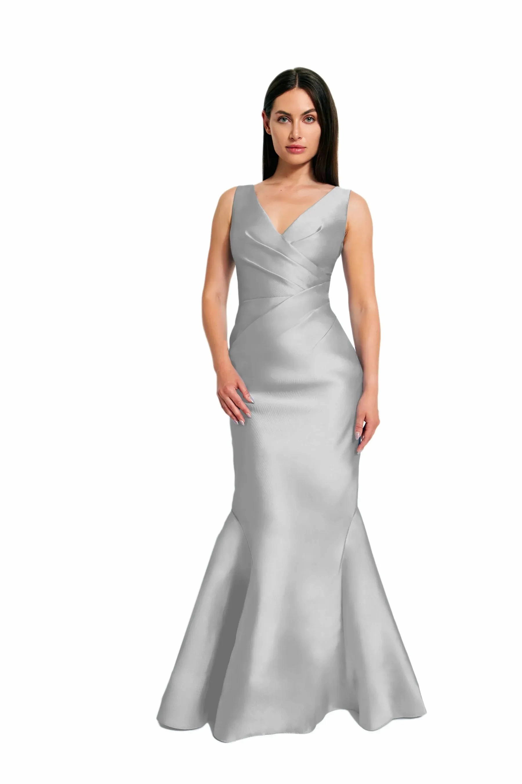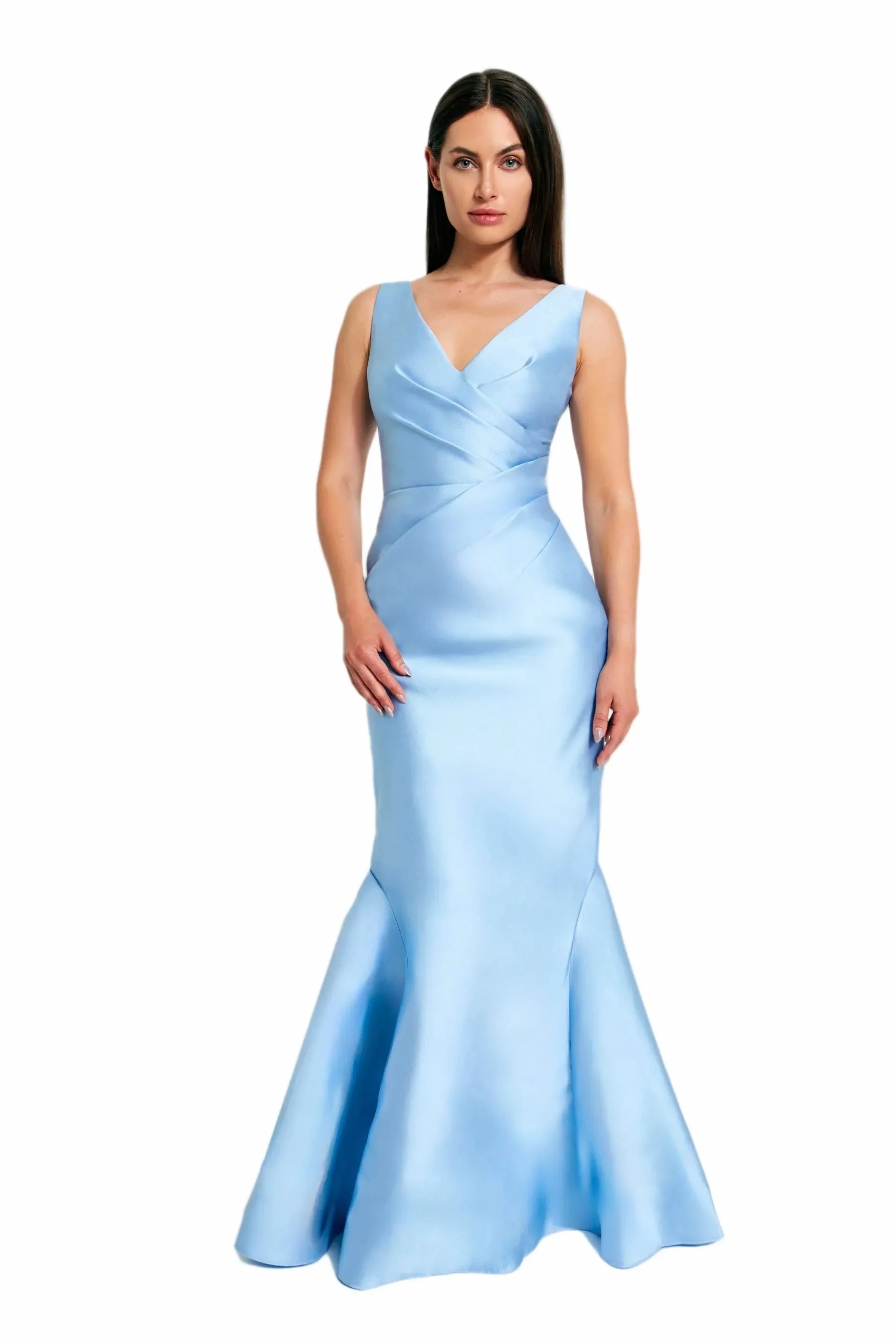 Elevate your style with this stunning V-neck top, highlighted by distinctive diagonal pleating at the waist. The elegant mermaid skirt, enhanced with godets, creates a graceful silhouette. Crafted from refined Mikado fabric, this ensemble radiates sophistication.
