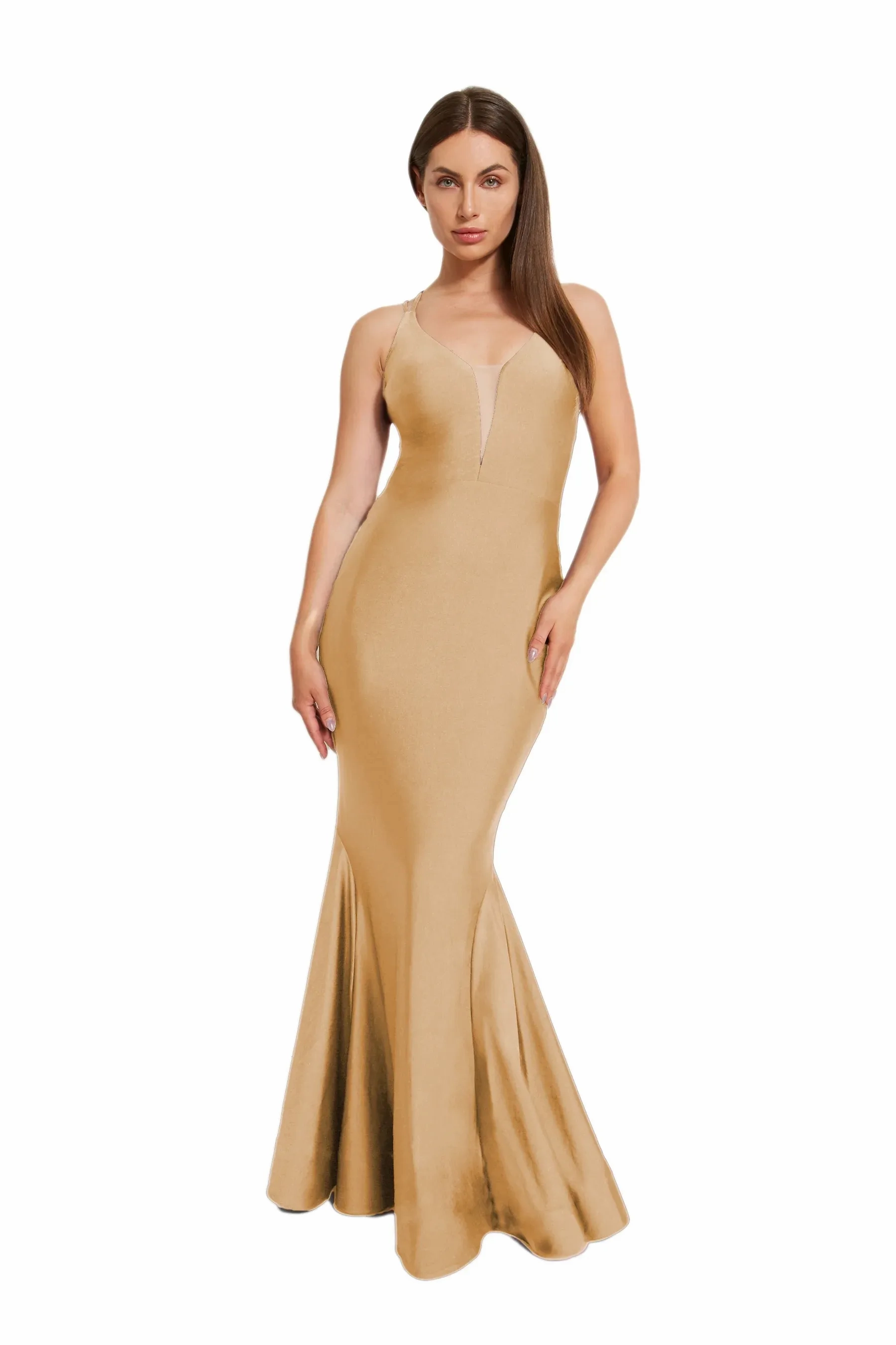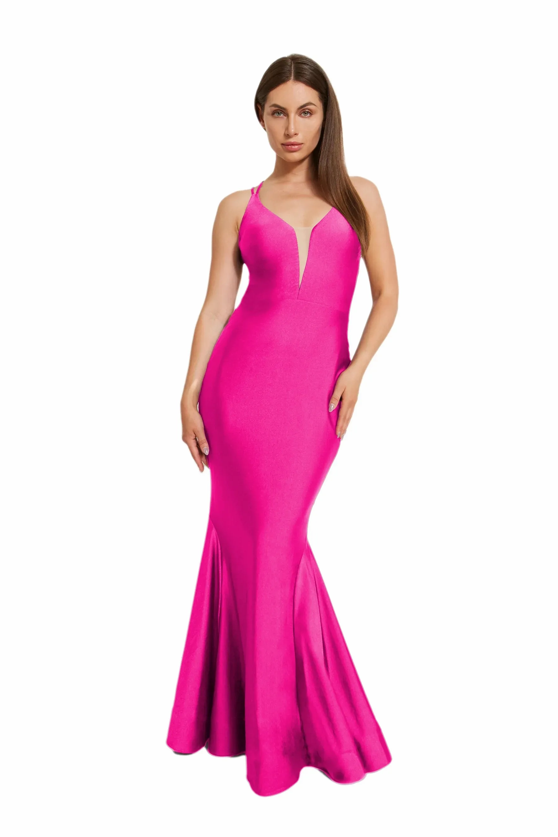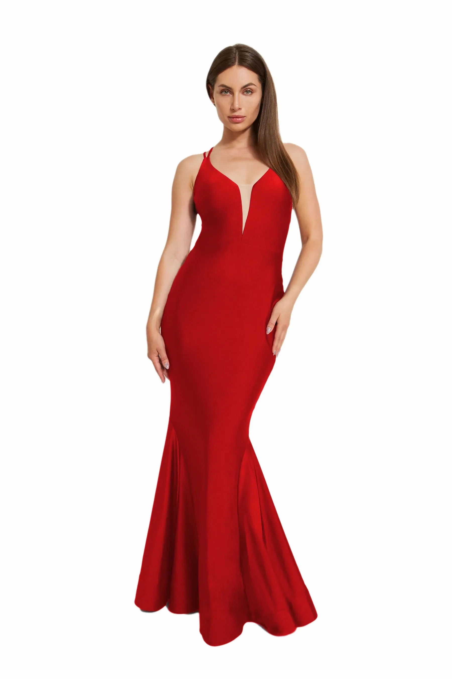 This dress is all about the va-va-voom with its curve-loving fit and daring deep V neckline adorned with mesh accent. Turn around, and you'll find double crossed straps adding a dash of drama, while the skirt fans out into a mermaid silhouette with playful godets and horsehair trim. Thanks to its 4-way stretch fabric, comfort is key, with knee length lining for added coverage. For those lighter hues, go for the full-length lining upgrade. for full coverage.