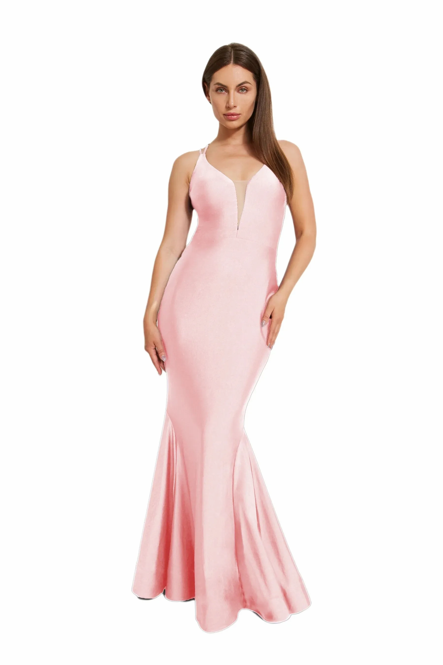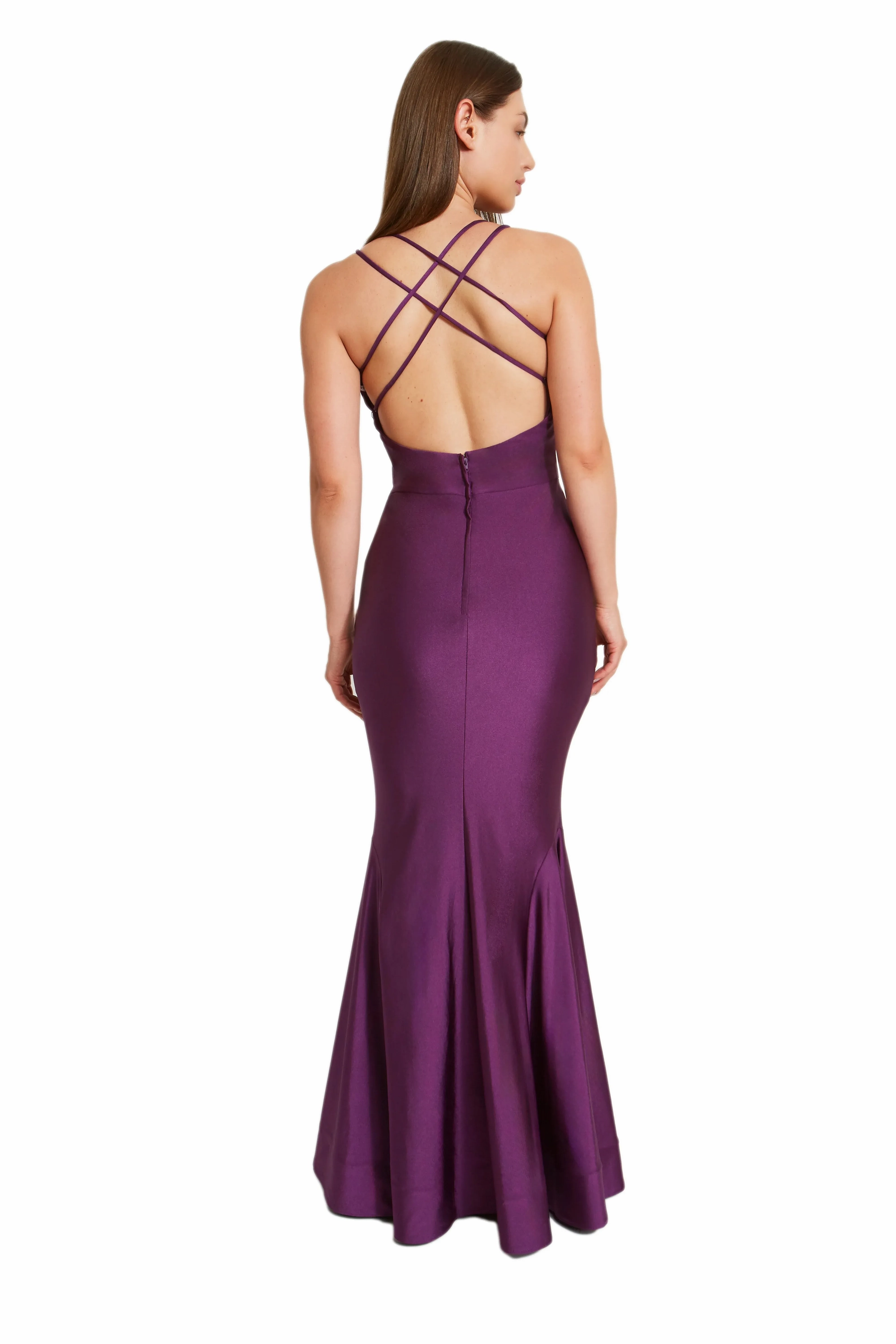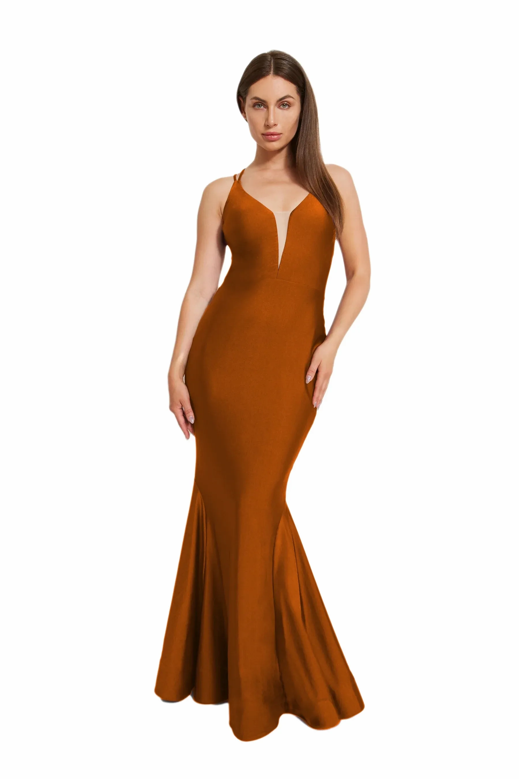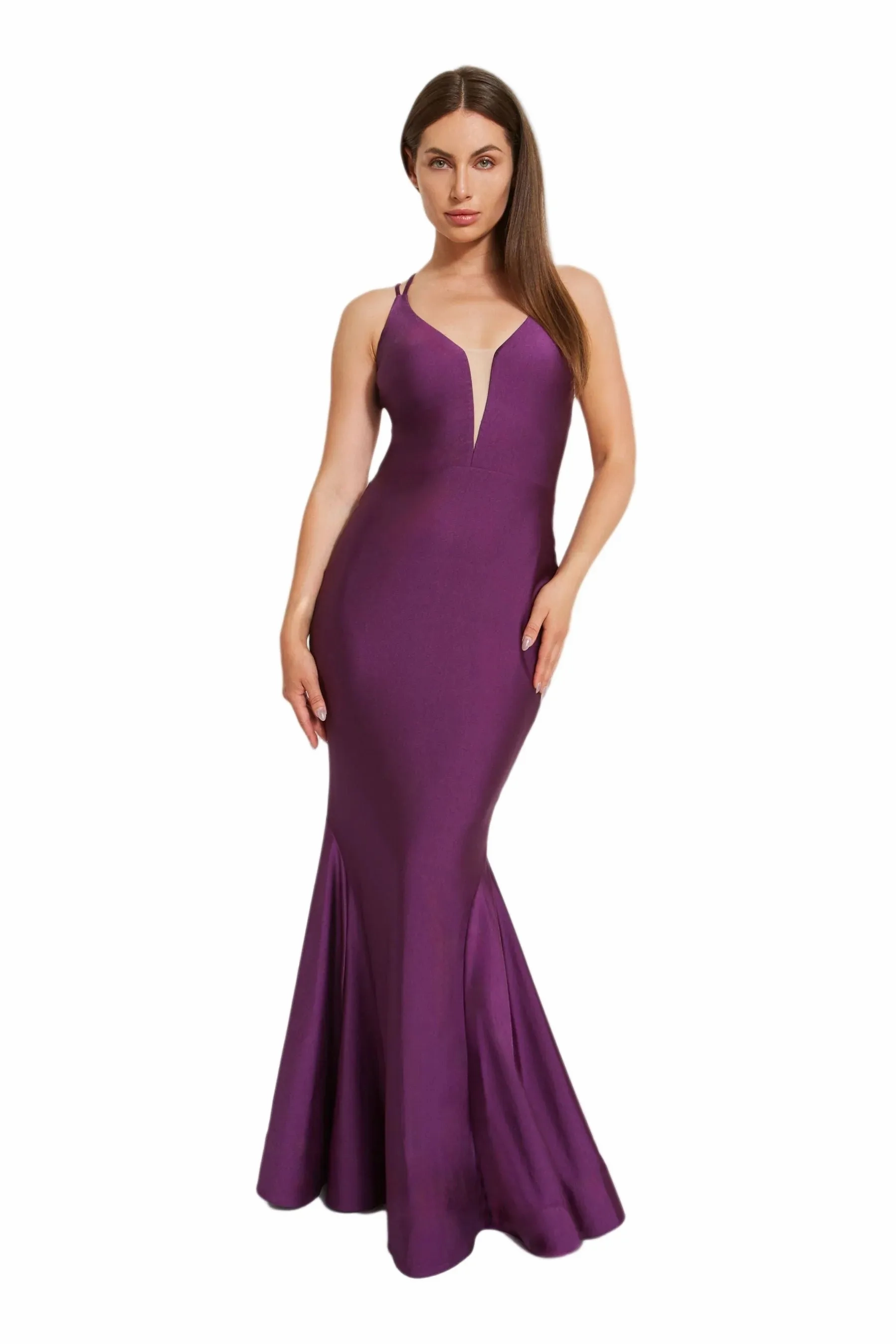 This dress is all about the va-va-voom with its curve-loving fit and daring deep V neckline adorned with mesh accent. Turn around, and you'll find double crossed straps adding a dash of drama, while the skirt fans out into a mermaid silhouette with playful godets and horsehair trim. Thanks to its 4-way stretch fabric, comfort is key, with knee length lining for added coverage. For those lighter hues, go for the full-length lining upgrade. for full coverage.
