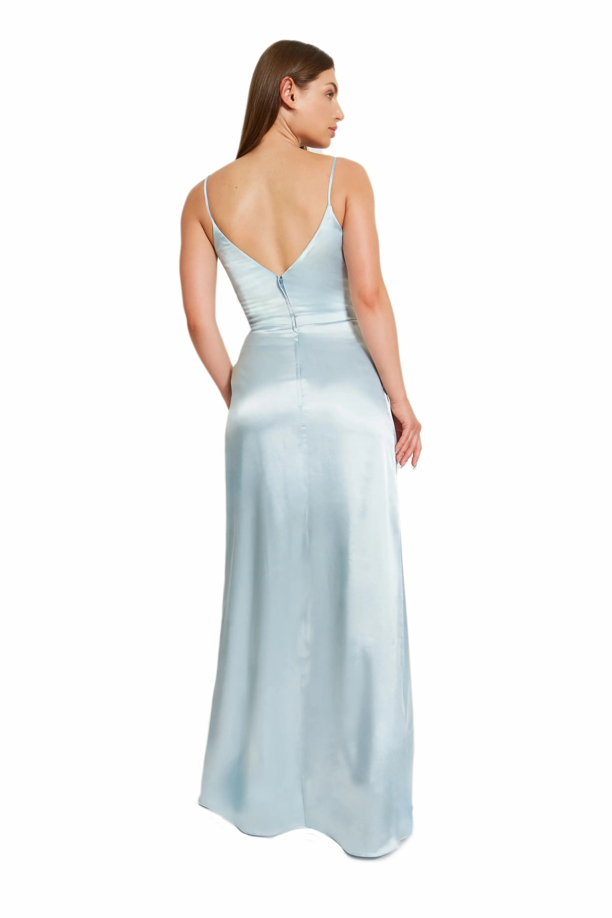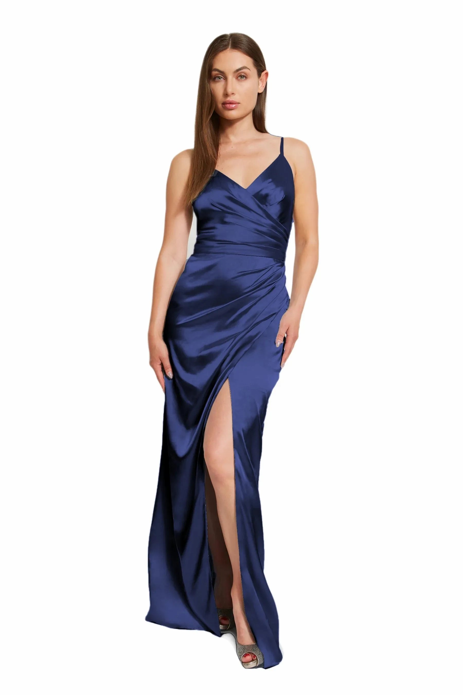 This top features a stylish V neckline and a unique asymmetrical pleated bodice, complemented by delicate spaghetti straps. The faux wrap skirt adds a touch of elegance and includes a flirty slit. Made from luxurious charmeuse material.