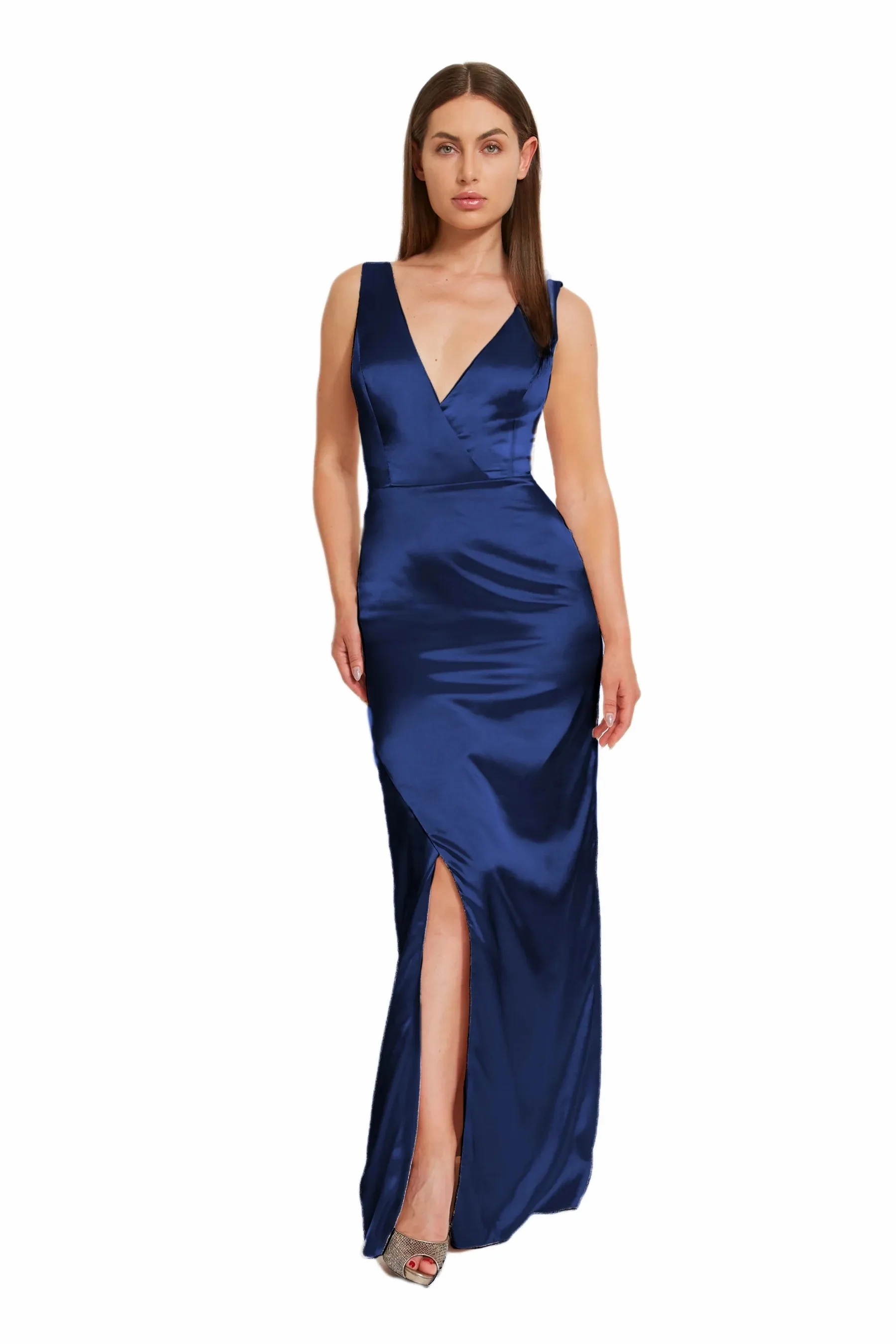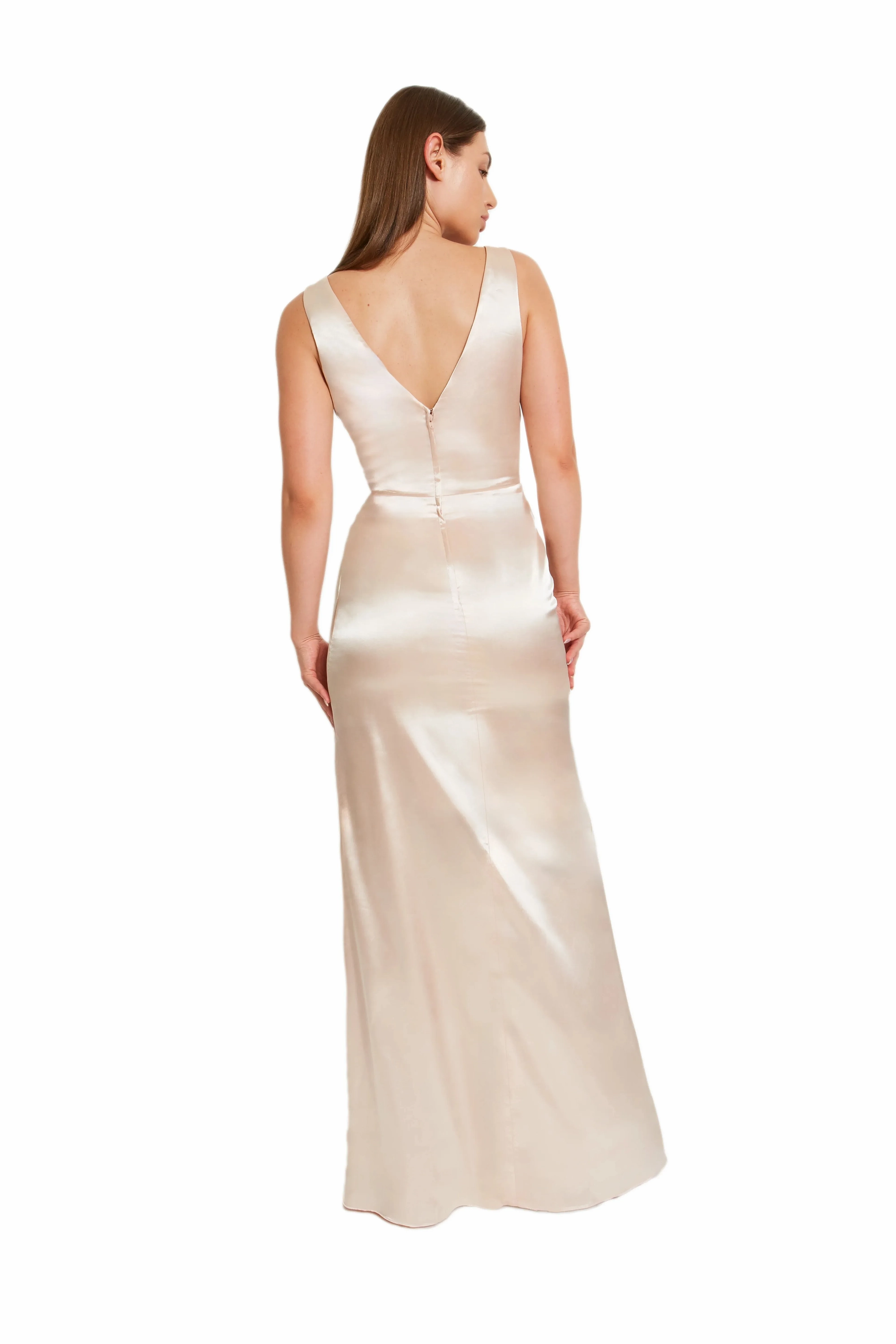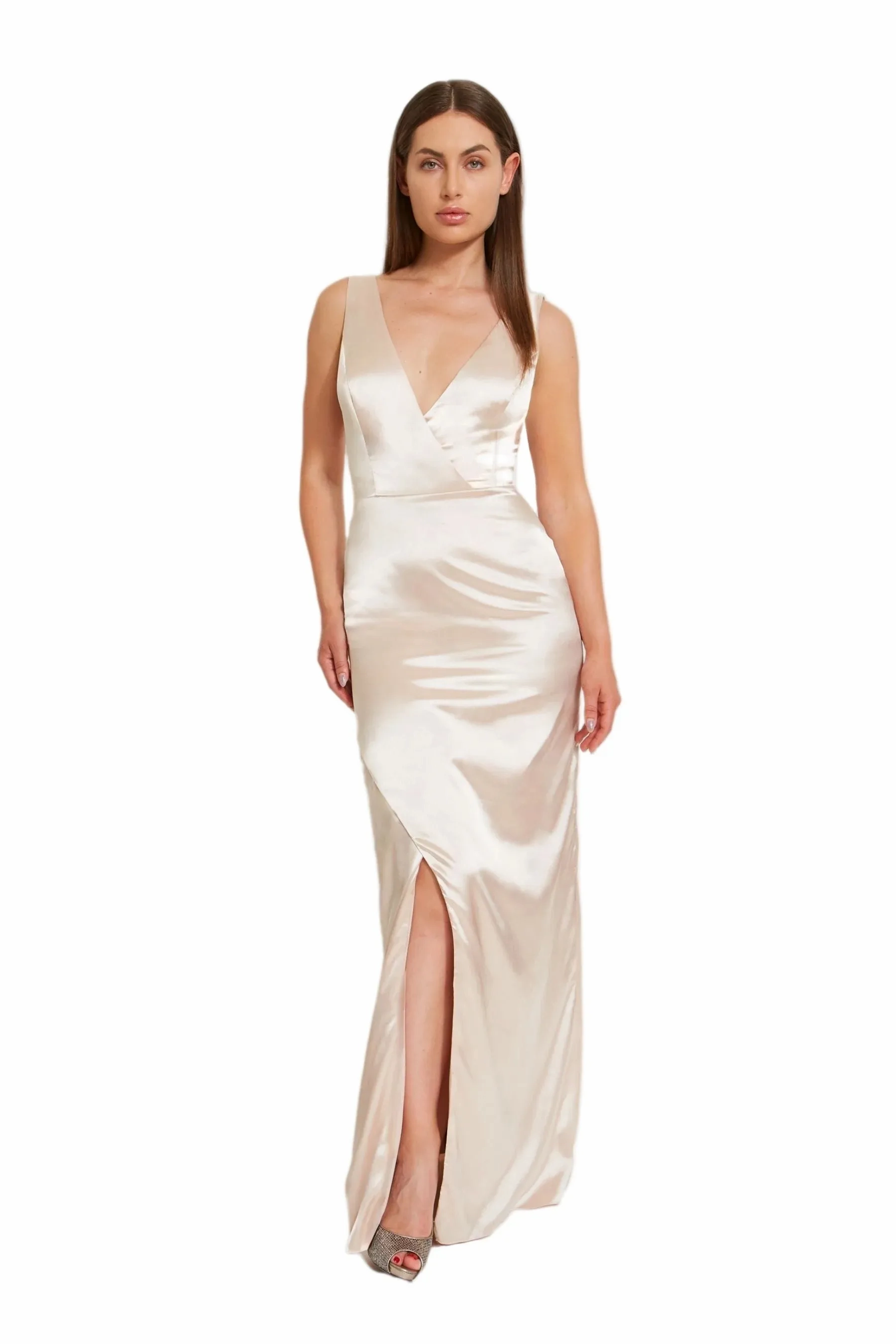 This sleek and modern style is elegantly styled boasting an overlapping V-neck top with wide straps, paired with a charming A-line skirt featuring a stylish slit. Made from delicate charmeuse fabric.