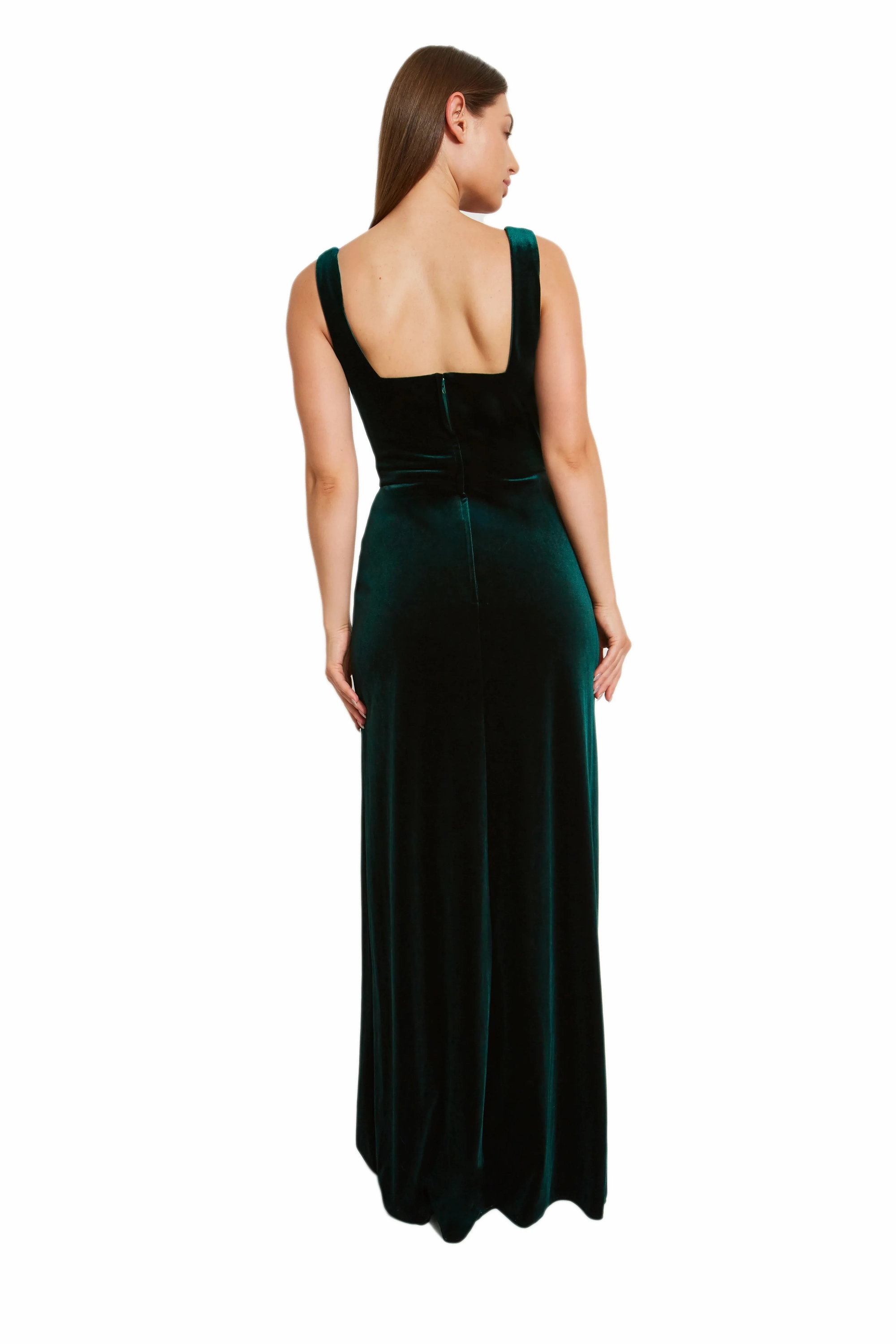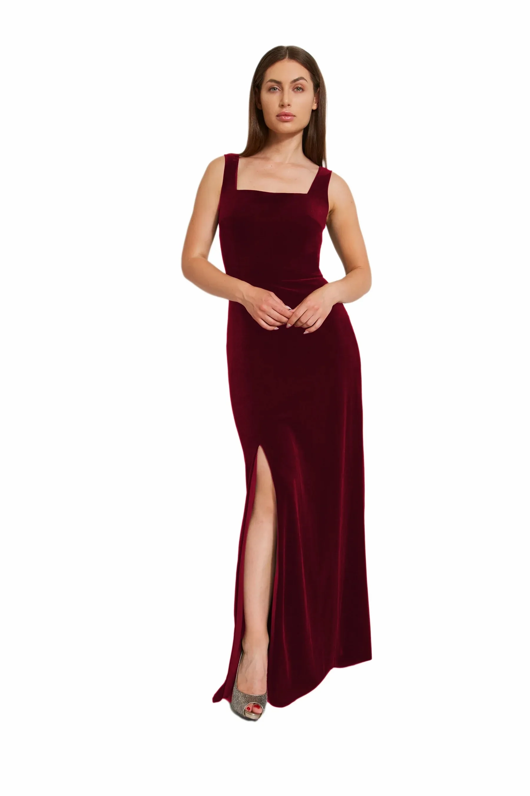Indulge in timeless elegance with this square-necked dress featuring thick straps and a delicate front slit in the slim fitting skirt. Crafted from plush velvet, this piece exudes sophistication and quiet luxury.