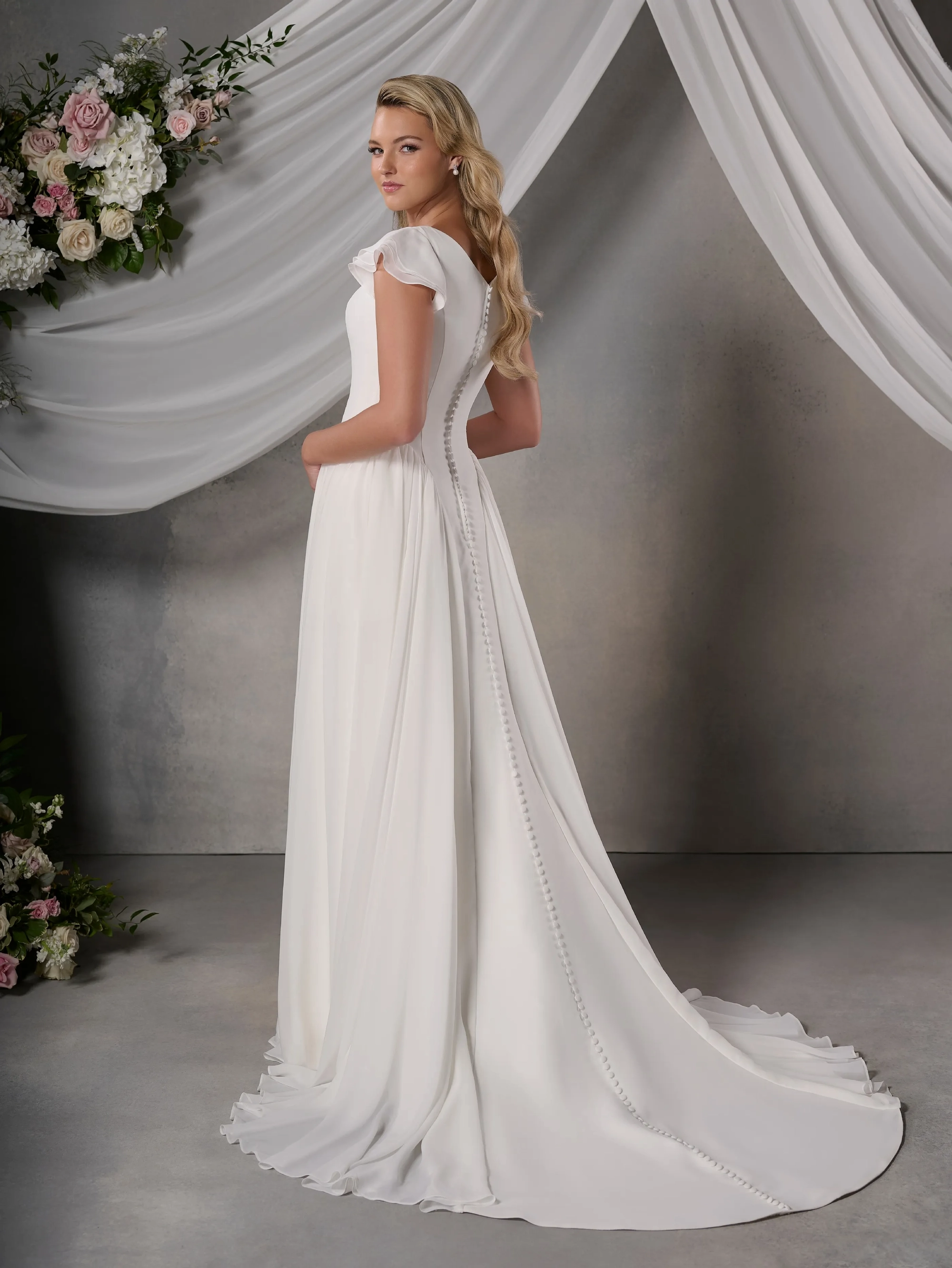 A-line style in chiffon with V-neck and short ruffle sleeves. Covered buttons along zipper closure and all the way down to train are.