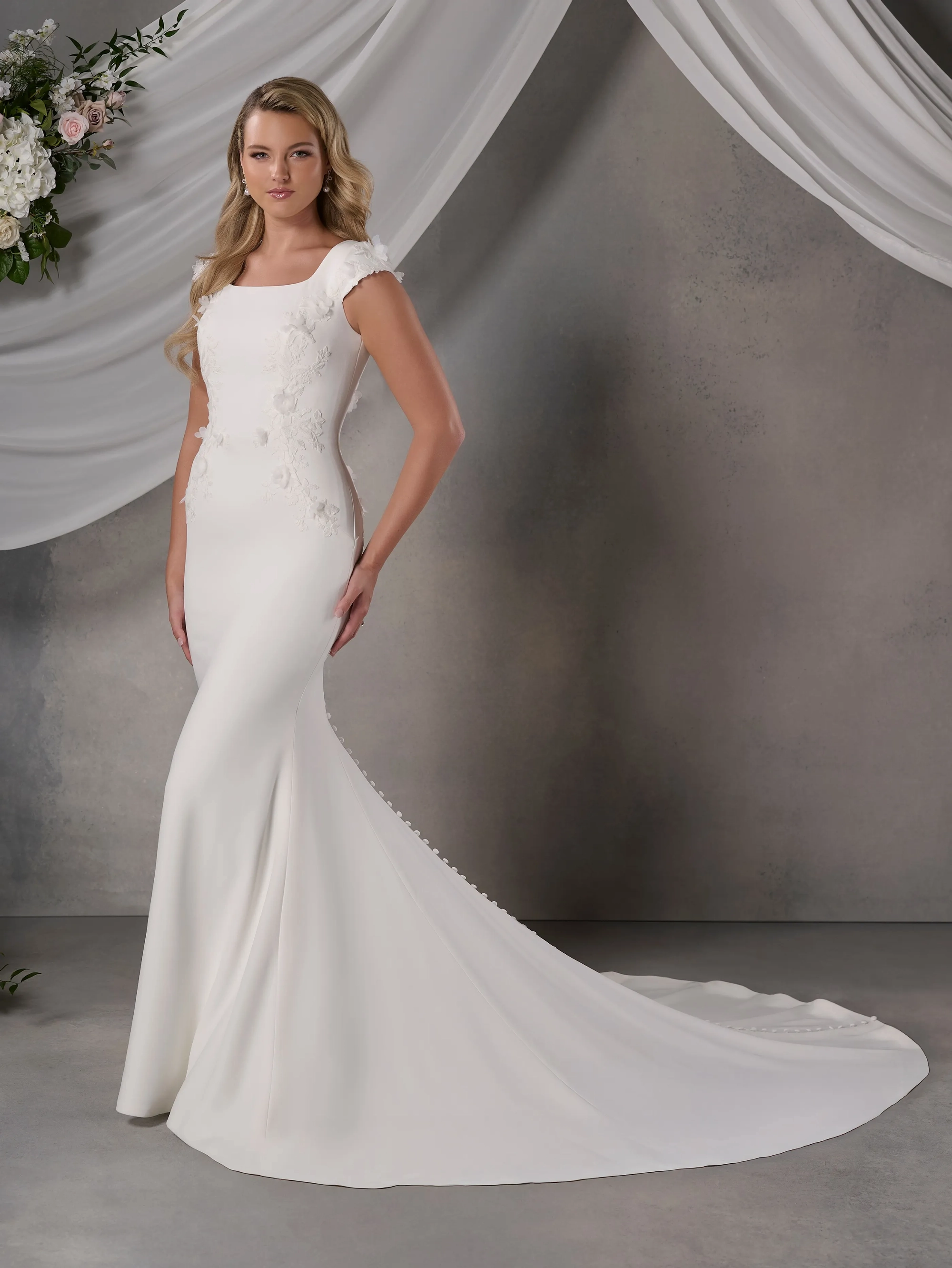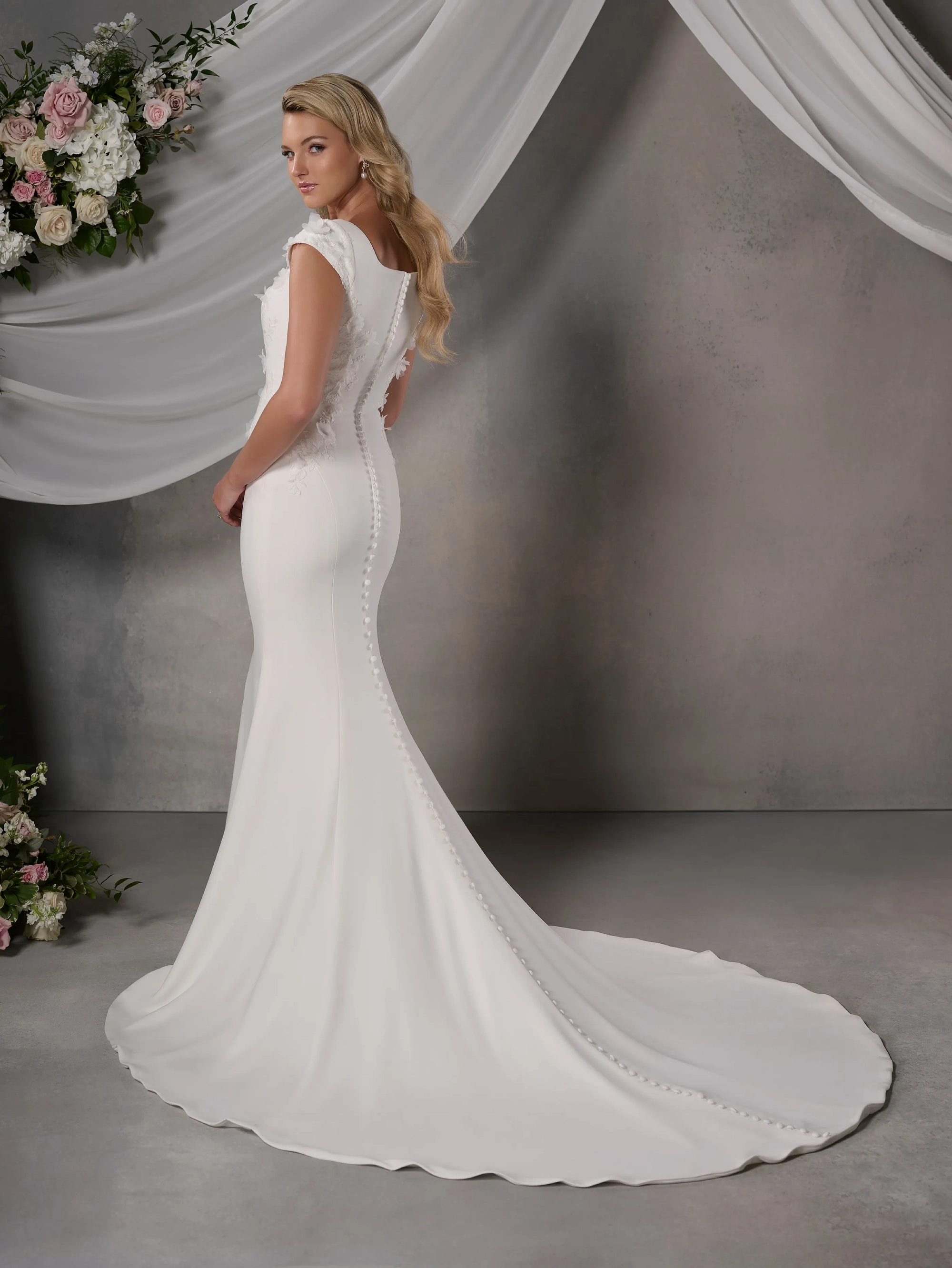 Slim crepe style with square neck decorated with lace motifs along princess seams. Covered buttons along zipper closure and all the way to train area.