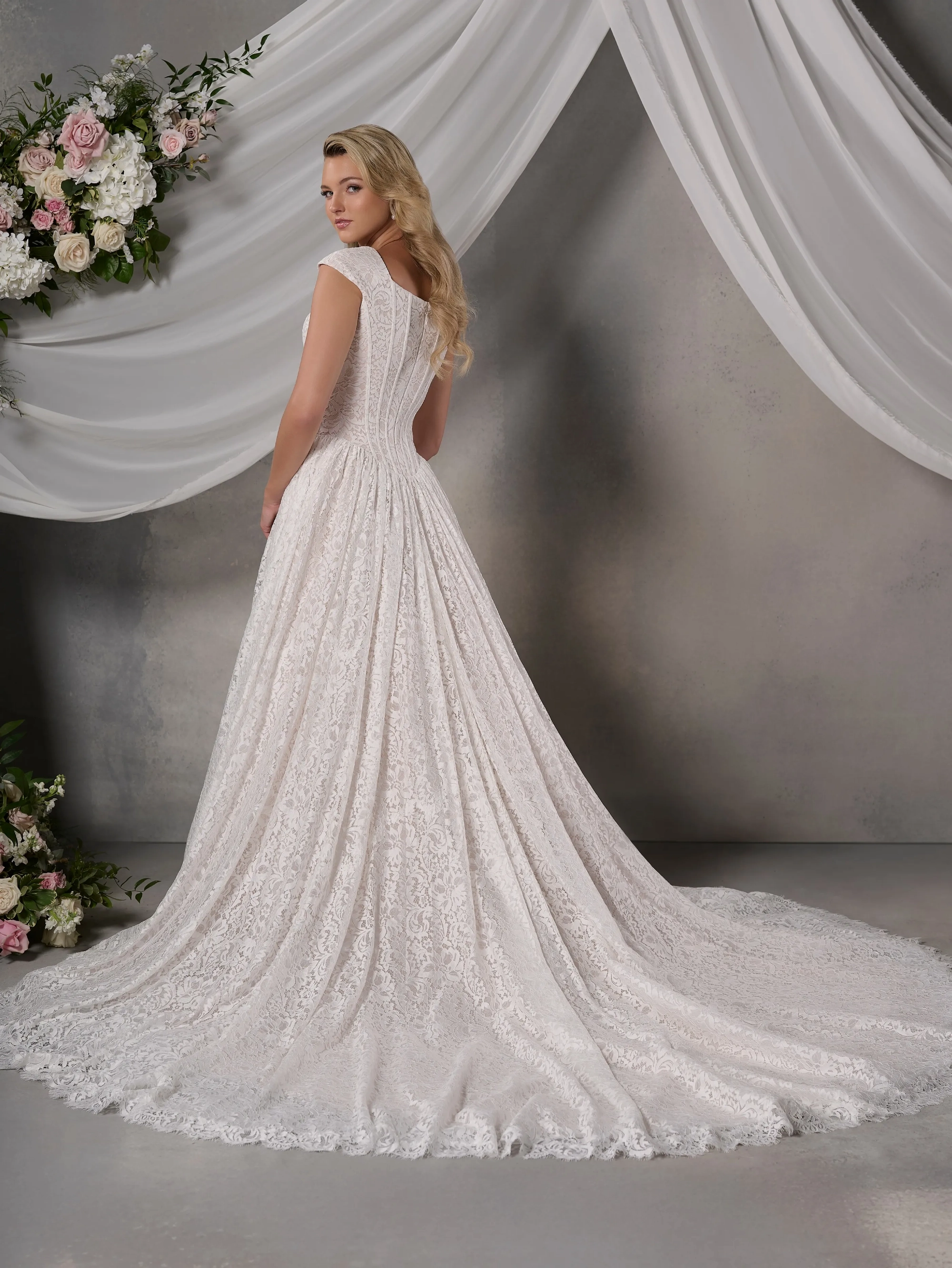 Lace ball gown with square neckline and cup sleeves, has built in corset with exposed boning. Invisible zipper back closure.