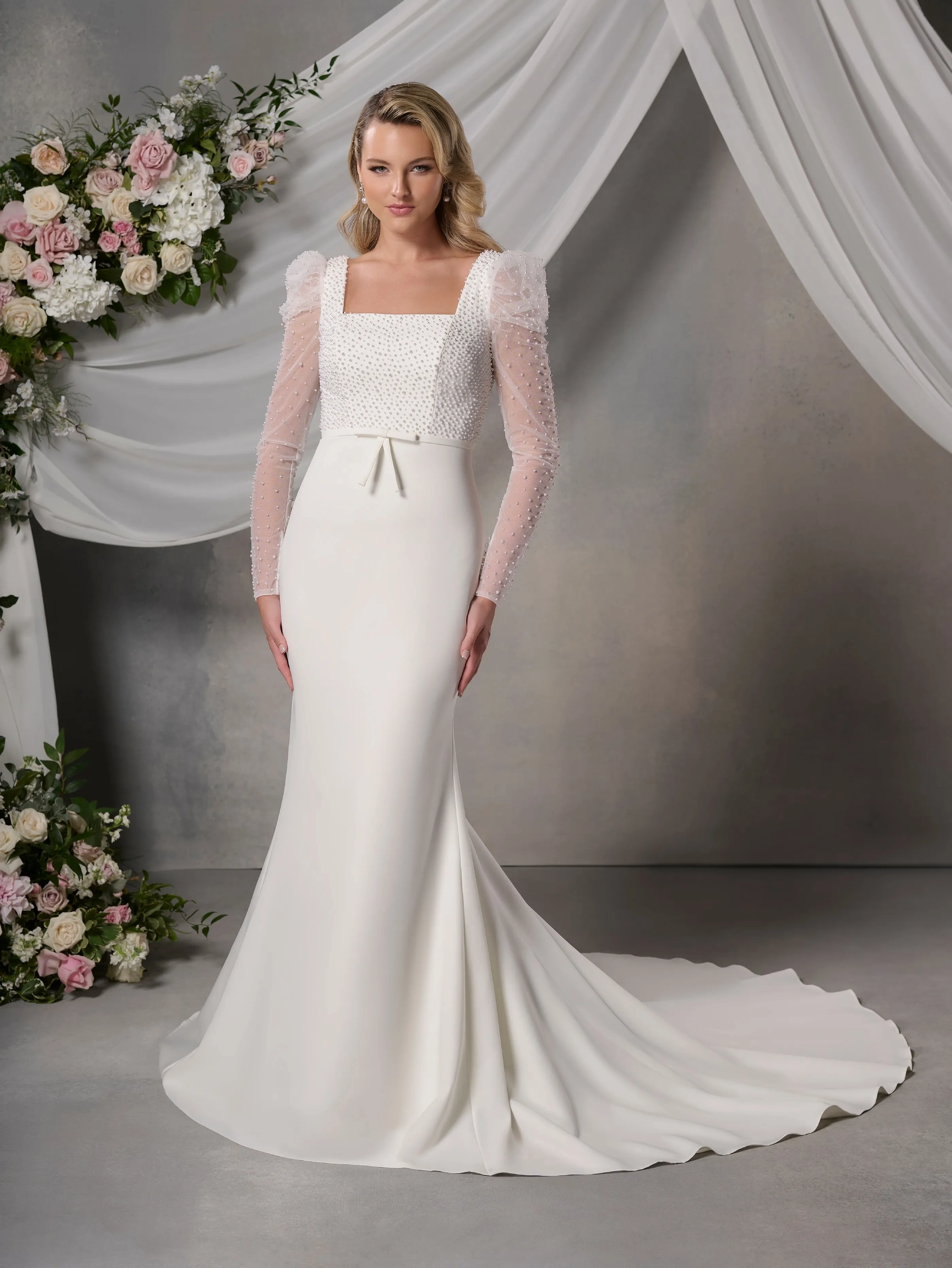 Slim gown with crepe skirt and pearl beaded bodice. Sheer sleeves with puffy shoulder area - all in pearl beaded tulle.
