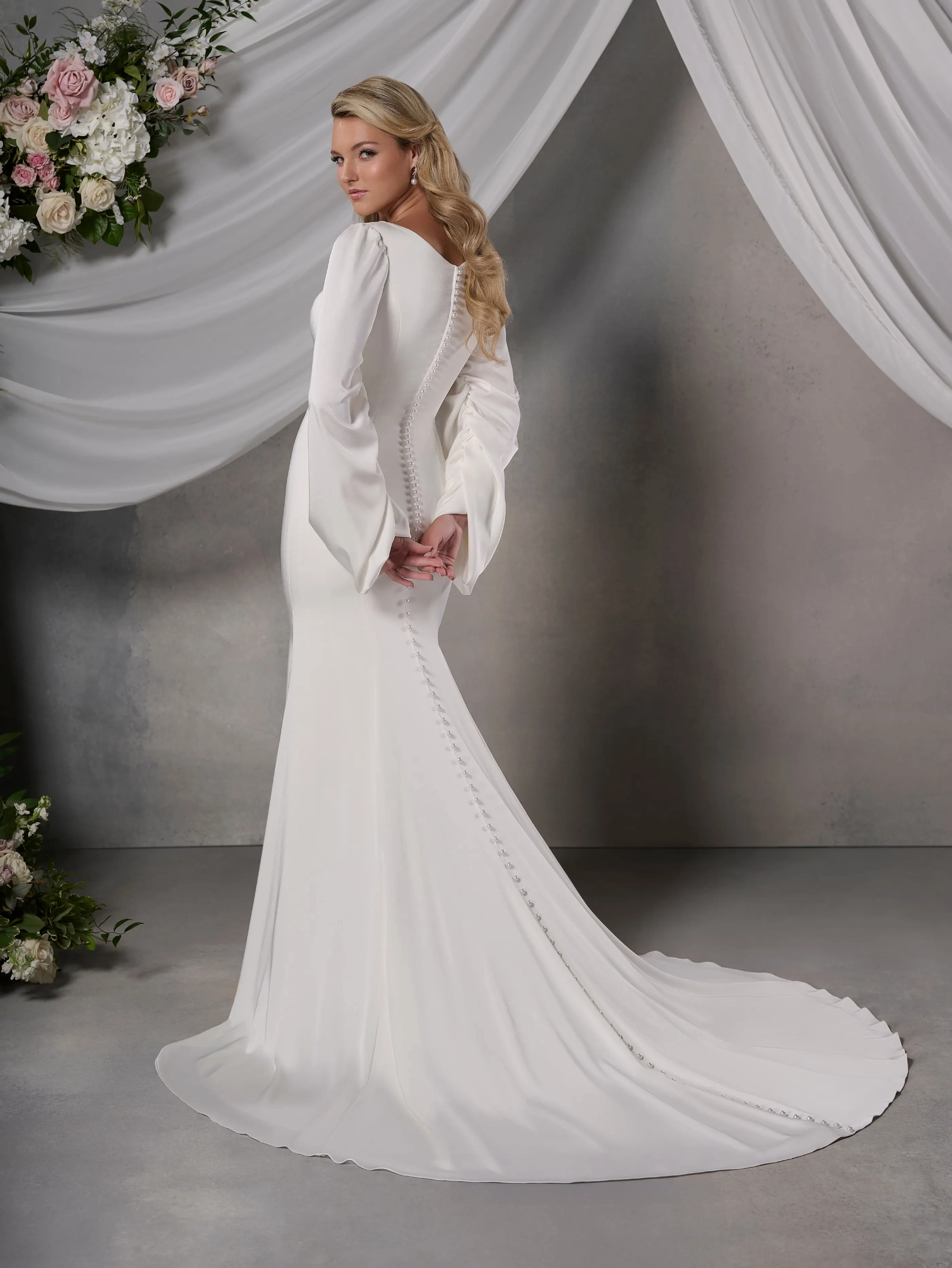 Slim style in stretch charmeuse with V-neck and baggy sleeves gathered along the seam. Pearl buttons along zipper closure and all the way down to hemline.