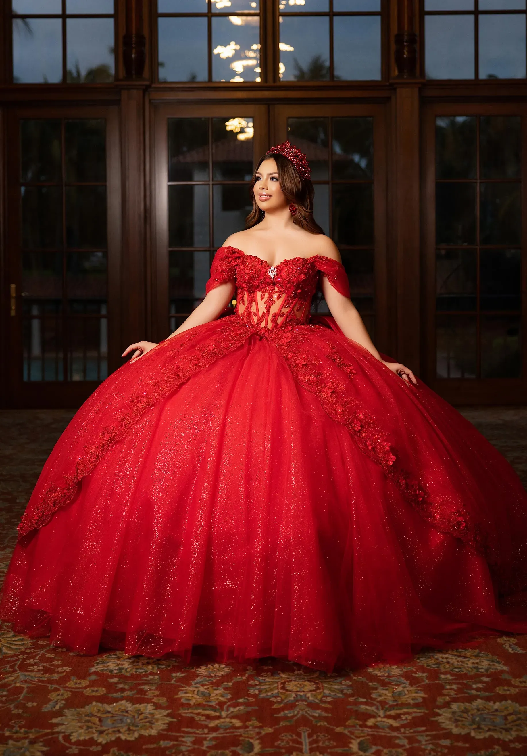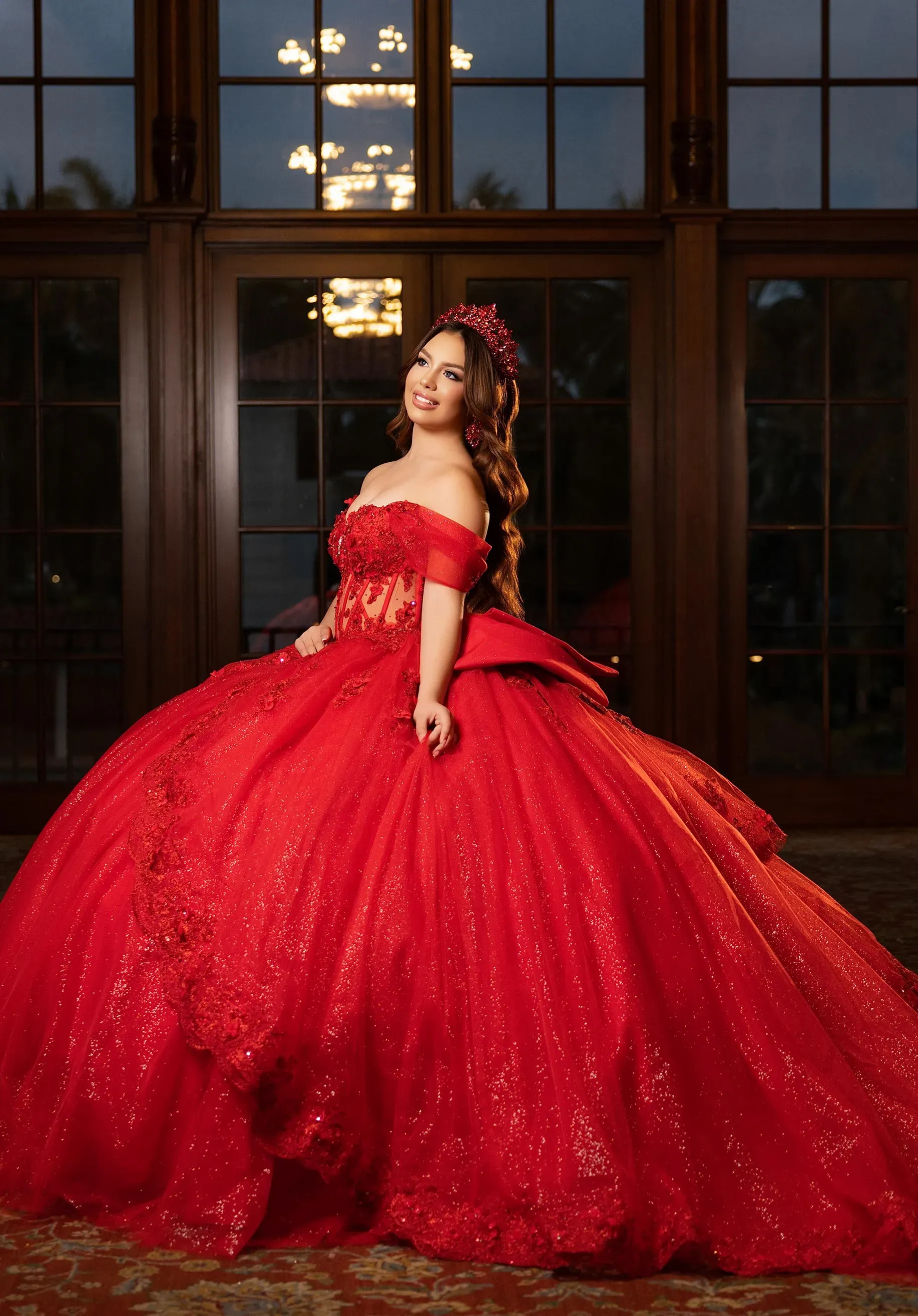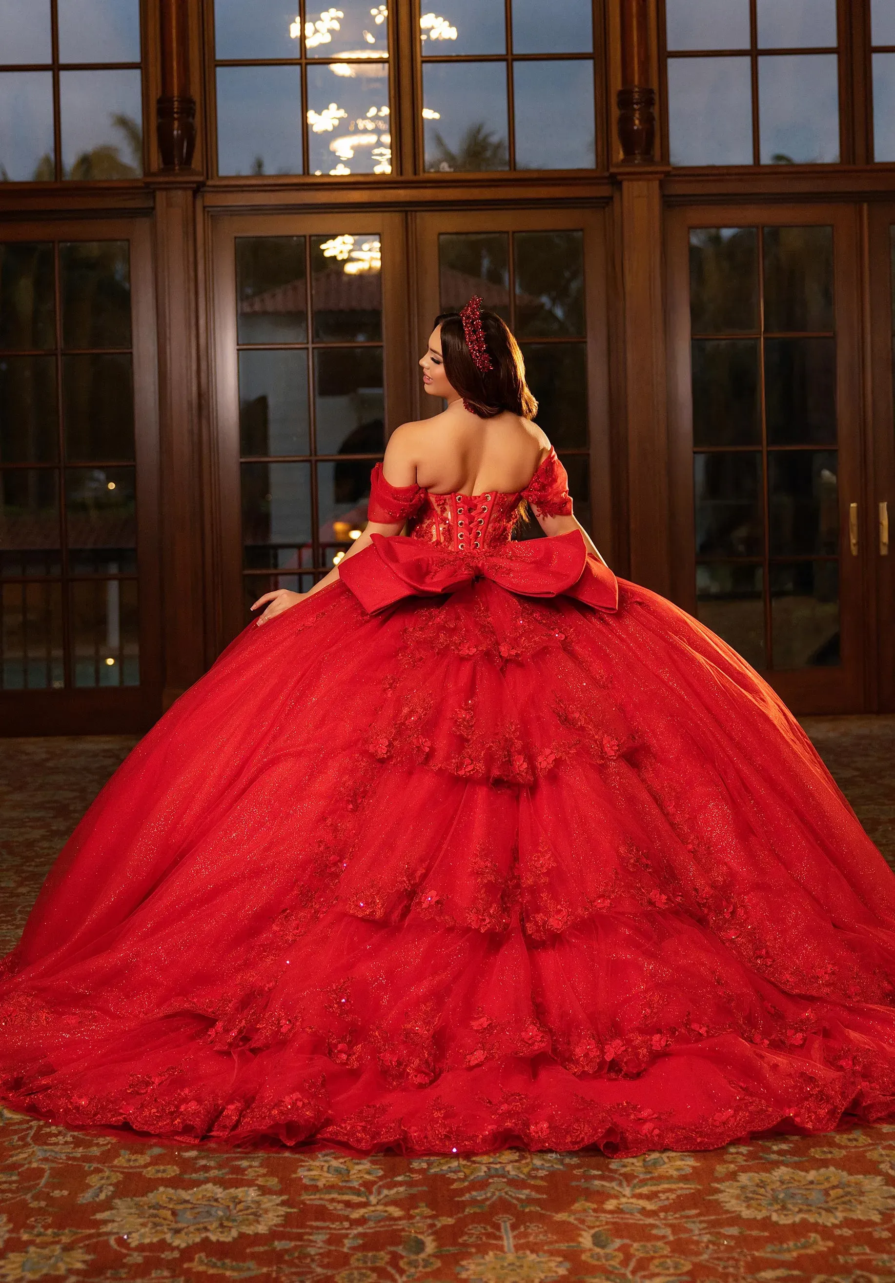 Classic quinceanera ball gown has a sweetheart bodice designed with beaded, three-dimensional floral appliqués and a sheer midriff featuring stylized exposed boning. The basque waist enhancing the split skirt overlay, it's its dainty scalloped lace edge, over the full glitter tulle skirt. The tiered back inset, accented by floral lace, has a stunning waterfall effect, while the detachable off-the-shoulder sleeves and sweet back bow give you versatility when styling the dress. Matching stole included.